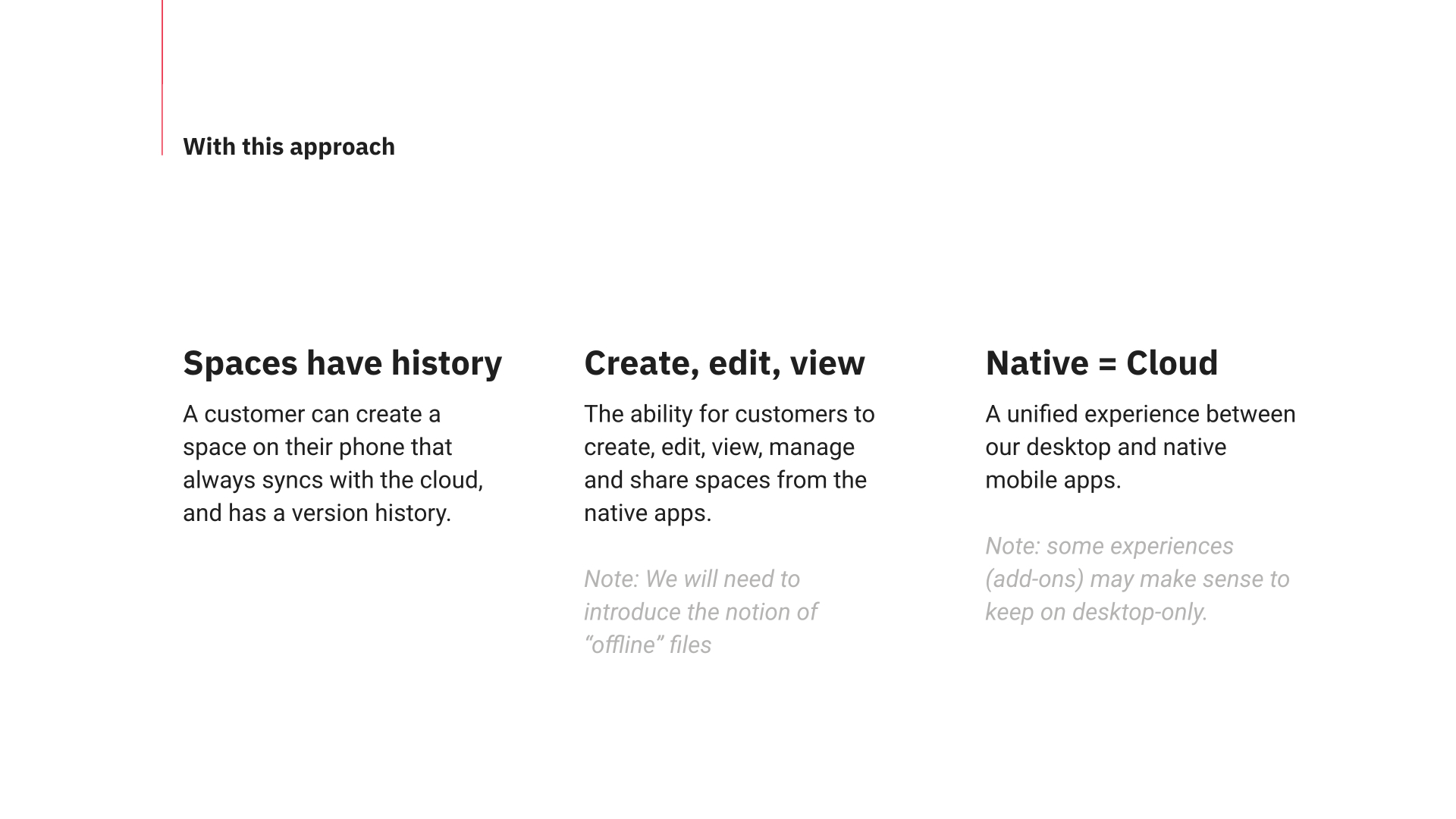 One of the first things I did when I moved from design lead to director was kick off a one-month design sprint to articulate this unified experience concept, create designs, and test with some of our Enterprise customers. The designs and research helped sell a major platform investment directly to our CEO. At the time, my "team" was just myself and one other designer. By the time I left, I was managing 5 designers, and we had a more unified product, engineering and design team.
